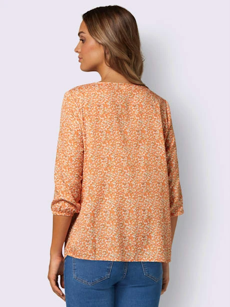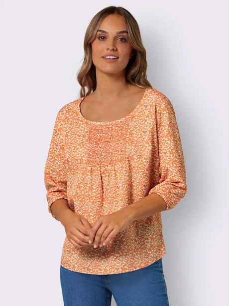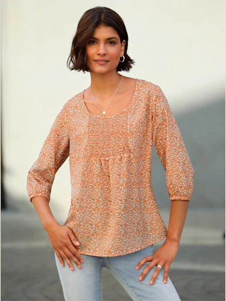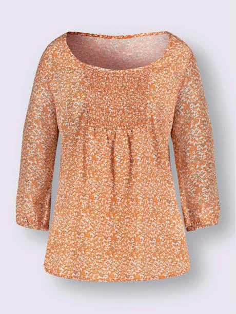 Motif minimaliste tendance : tunique avec empiècement smocké décoratif et fronces devant. Encolure ronde passepoilée et manches 3/4 élastiquées.