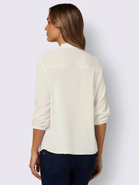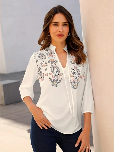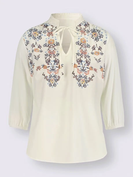 Tunique au col montant froncé avec liens à nouer et joli imprimé devant. Couture d’épaule avancée et légères fronces. Manches 3/4 au tombé flatteur grâce aux finitions élastiques. Qualité crêpe fluide.