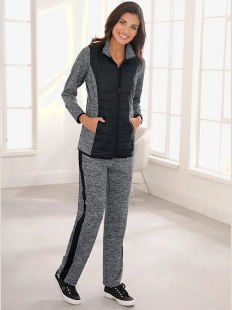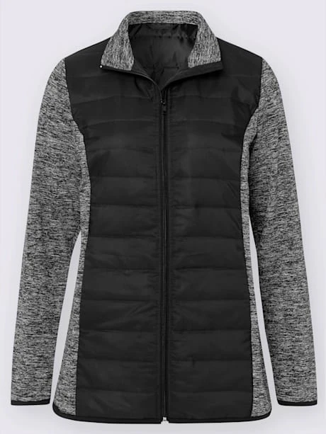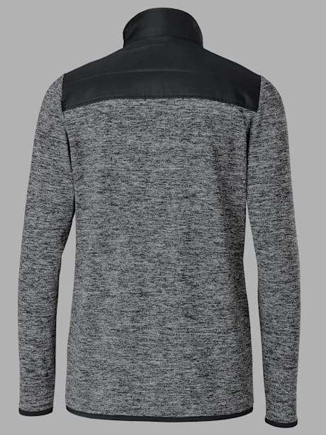 Veste de loisirs en différentes matières : Devant et empiècement au dos tissés, manches et reste du dos à l`aspect chiné. Col montant protecteur. Deux poches intégrées dans les coutures de séparation. Glissière avec mentonnière pour ne pas démanger !