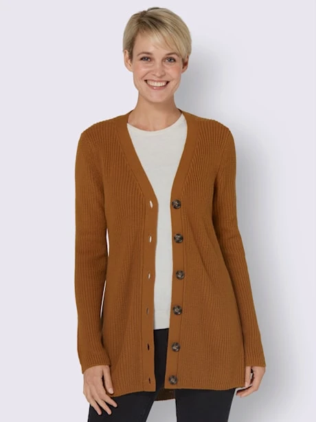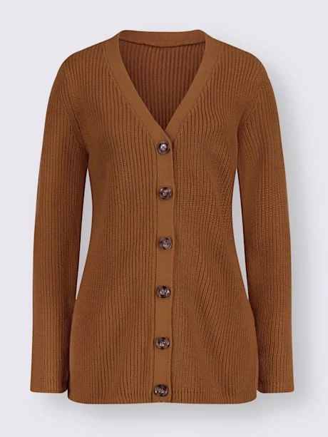 Veste en tricot coupe cardigan, finitions côtelées pour une coupe parfaite. Grands boutons décoratifs marbrés originaux. Encolure en V, forme plus longue et aspect côtelé longitudinal pour affiner la silhouette.