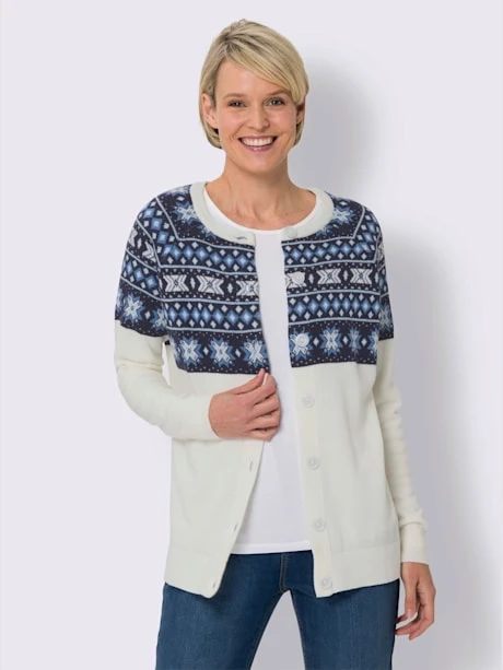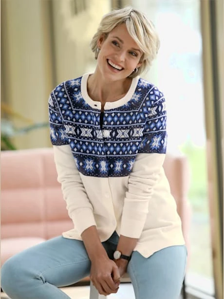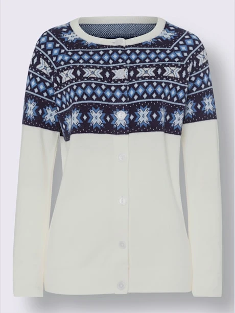 Veste en tricot moelleuse avec motif norvégien, encolure ronde et patte de boutonnage sur toute la longueur. Finitions côtelées aux manches longues raglan et à l’ourlet.