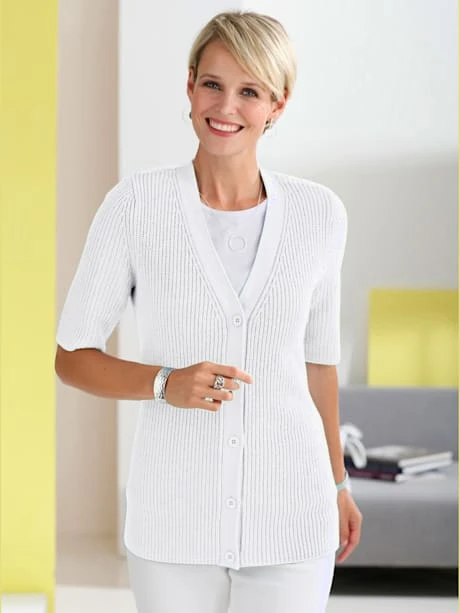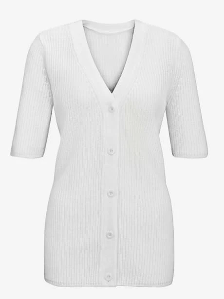 Idéale pour la saison chaude ! Veste en tricot avec manches courtes rallongées tendance, encolure en V et patte de boutonnage sur toute la longueur. Magnifique motif structuré attirant les regards. Finitions côtelées pour une coupe parfaite.