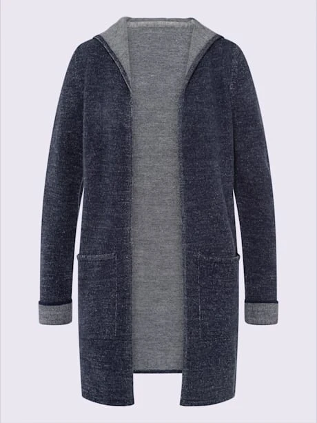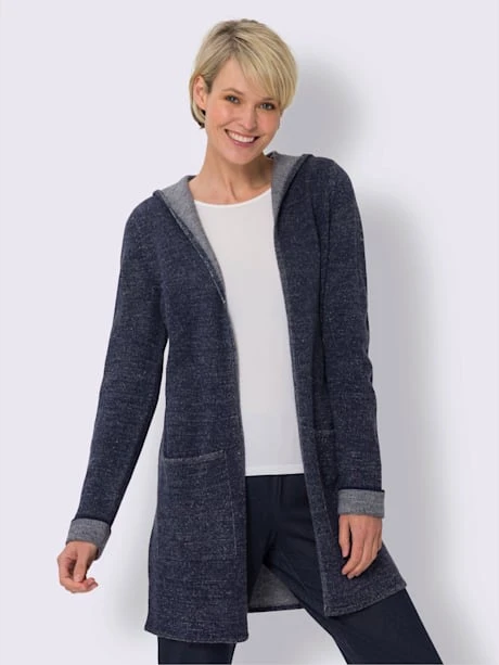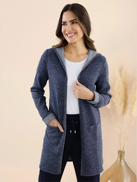 Veste en tricot chaude et douce à la coupe ouverte tendance. Capuche et 2 grandes poches plaquées. Manches longues à bordure contrastée.